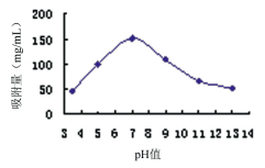 2.3.1.3    吸附pH的考察  將一定量的那他霉素浸提液分別調節成不同pH,然后使用HZ816樹脂吸附,考察pH對HZ816樹脂吸附量的影響,結果見圖4。